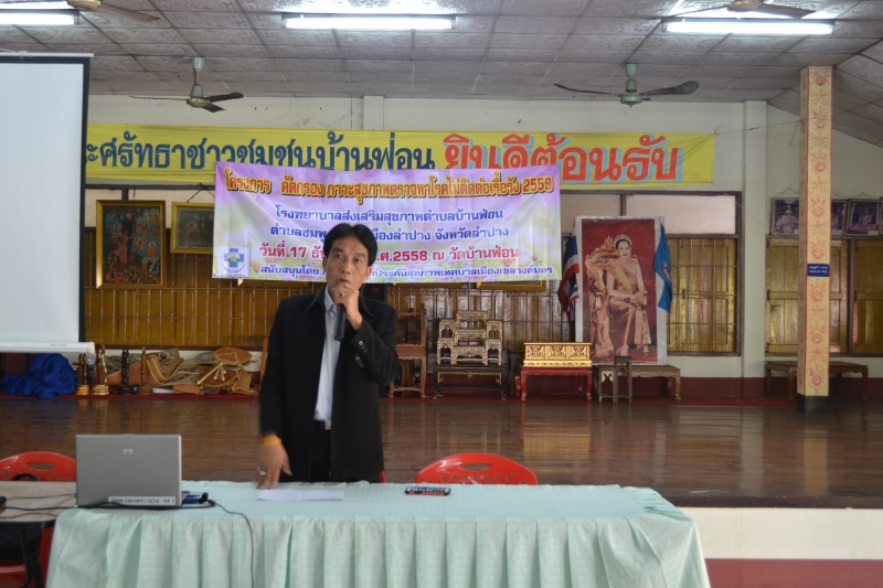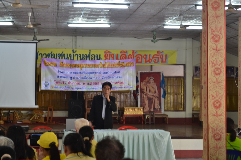 นายไพฑูรย์ โพธิ์ทอง นายกเทศมนตรีเมืองเขลางค์นคร ได้มอบหมายให้ นายบุญเรือน เครือวิยะ เลขานุการนายกเทศมนตรี เป็นประธานในการเปิดโครงการ คัดกรองภาวะสุขภาพตรวจหาโรคไม่ติดต่อเรื้อรัง ปี 2559 วันที่ 17 ธันวาคม 2558 ณ.วัดบ้านฟ่อน